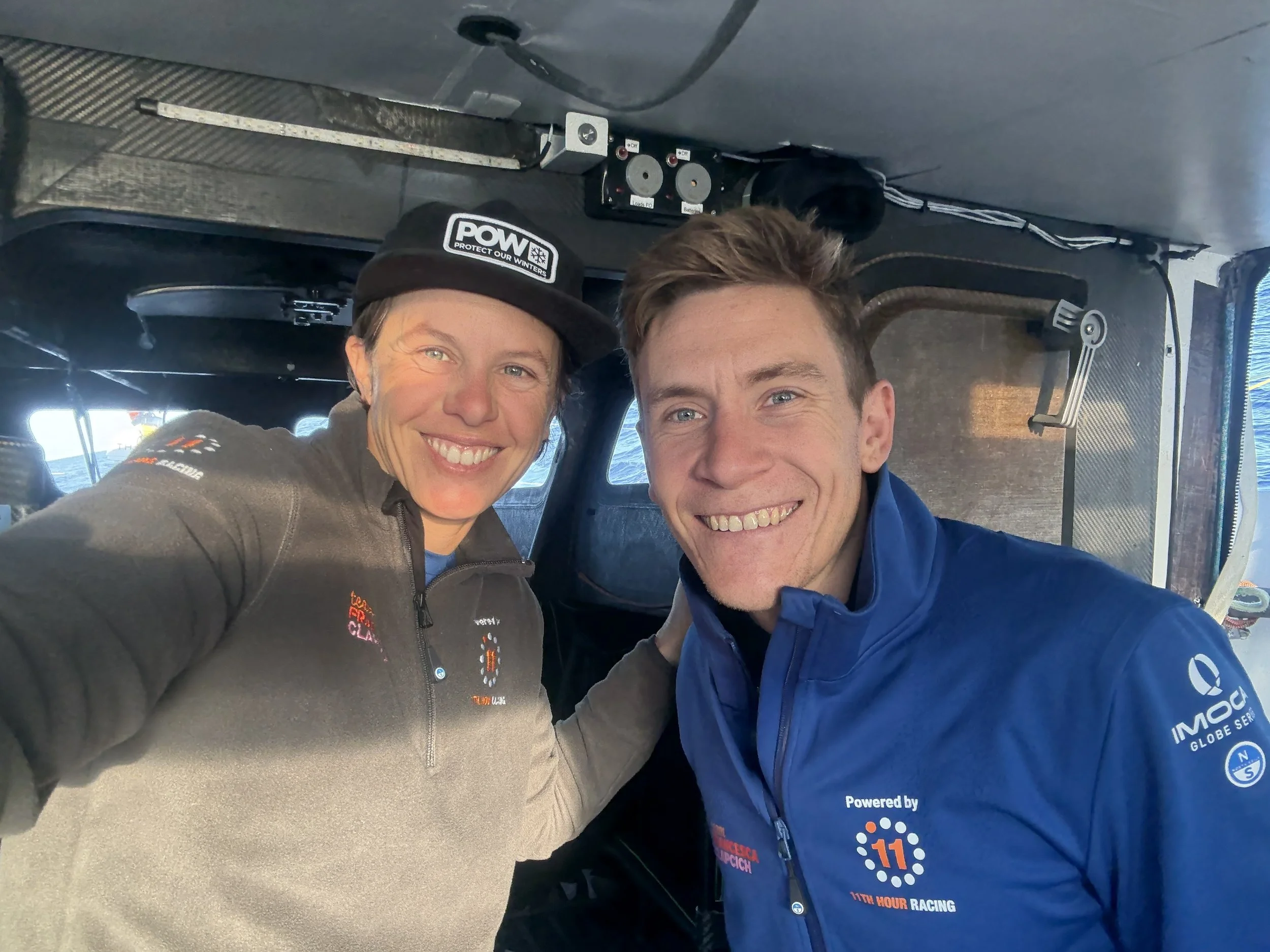 Francesca was on-watch as the sun came up on a beautiful flat sea and as the boat continued on its southerly heading. During the morning “vacation” [phone interview] with race headquarters, she paid tribute to Will’s work on strategy and his preparation for this race: “I need to give so much credit to Will because he worked really hard on preparation … and I think we really stuck with our strategy and, you know, it’s paying off.